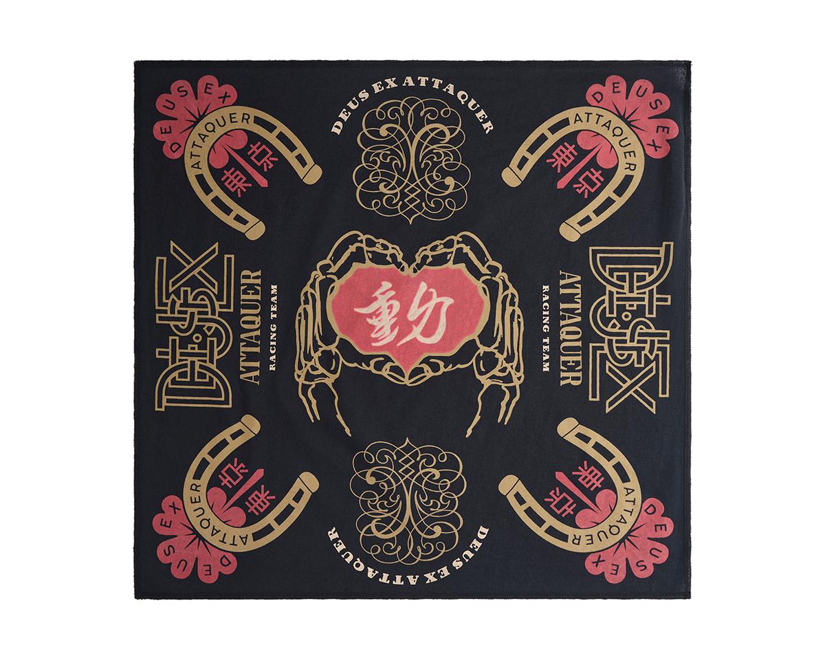 The Deus Ex Attaquer bandana embodies the collection’s bold energy, rooted in Japan’s custom bike scene and reimagined for everyday wear. Featuring a black base with all-over collaborative artwork, it brings style and attitude to any setting. Cut in a classic square from 100% cotton, it is soft, breathable, and endlessly versatile—tie it, wrap it, or wear it your way on or off the bike.